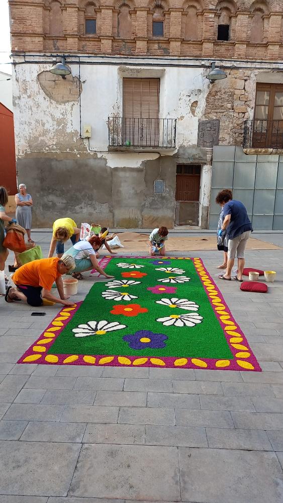 Las calles de Candasnos han vuelto a llenarse de alfombras y dibujos este domingo 19 de Junio para recibir a la procesión del Corpus Christi. Estas creaciones de arte efímero realizadas con 105 kg de arroz partido teñido con pintura y colorante es producto del esfuerzo de la Asociación de Amas de Casa "Corazón de Monegros".